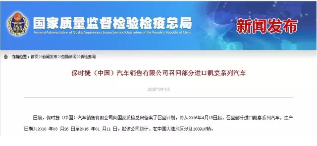 日前,保时捷(中国)汽车销售有限公司向国家质检总局备案了召回计划,将从2016年4月18日起,召回部分进口凯宴系列汽车,生产日期为2010年03月26日至2016年01月11日。据该公司统计,在中国大陆地区涉及108910辆。