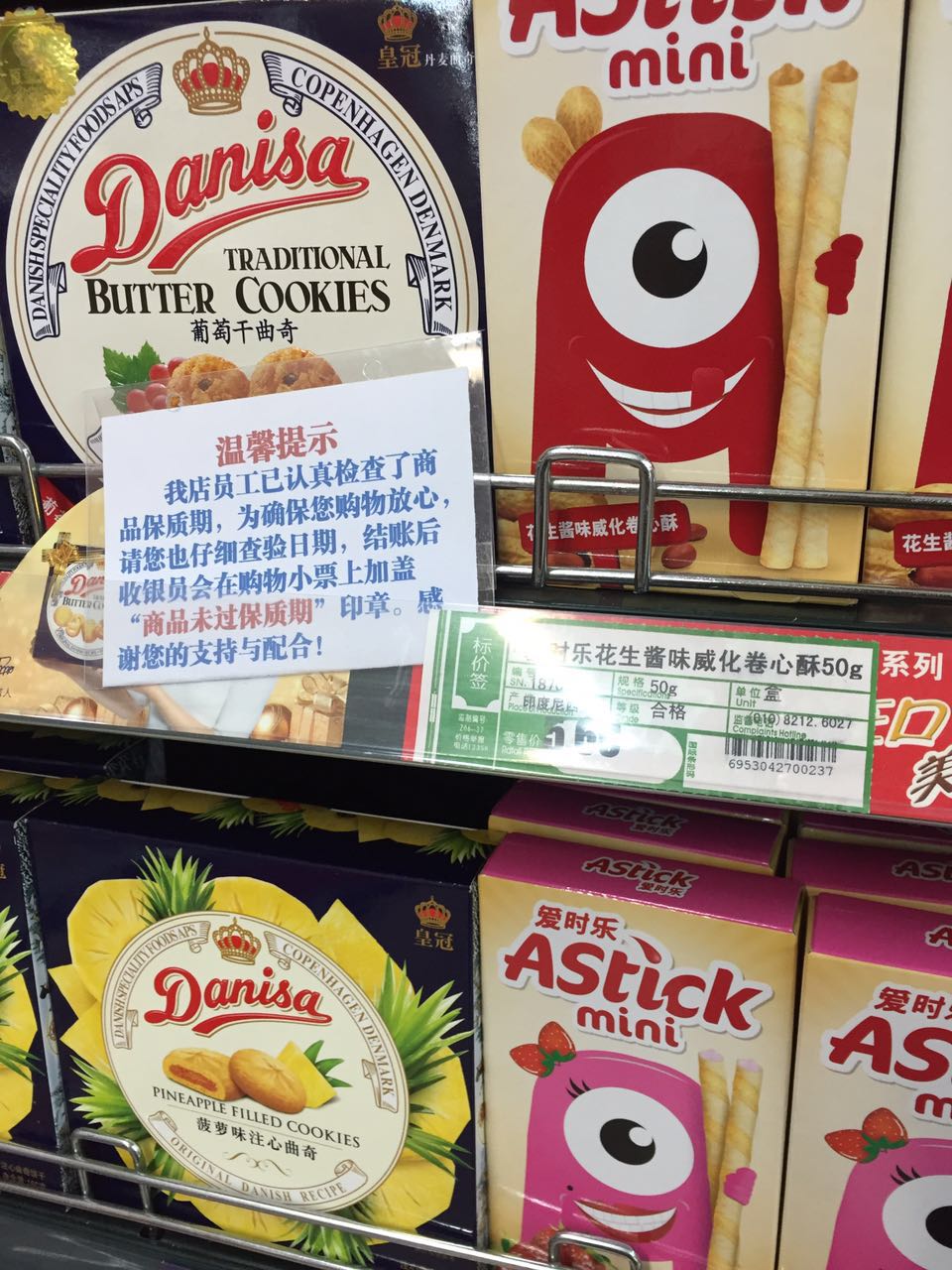在超市发玉泉路店,记者发现,货架上贴有“温馨提示”,内容是“我店员工已认真检查了商品保质期,为确保您购物放心,请您也仔细查验日期,结账后收银员会在购物小票上加盖‘商品未过保质期’印章。感谢您的支持与配合”。记者在超市买了一瓶矿泉水,收银员在购物小票上加盖了“商品未过保质期”印章。记者按照小票上的提示拨打客服电话咨询。工作人员告诉记者,盖章是为了防止恶意投诉,“盖章是公司要求,证明我们出售的商品未过保质期”。