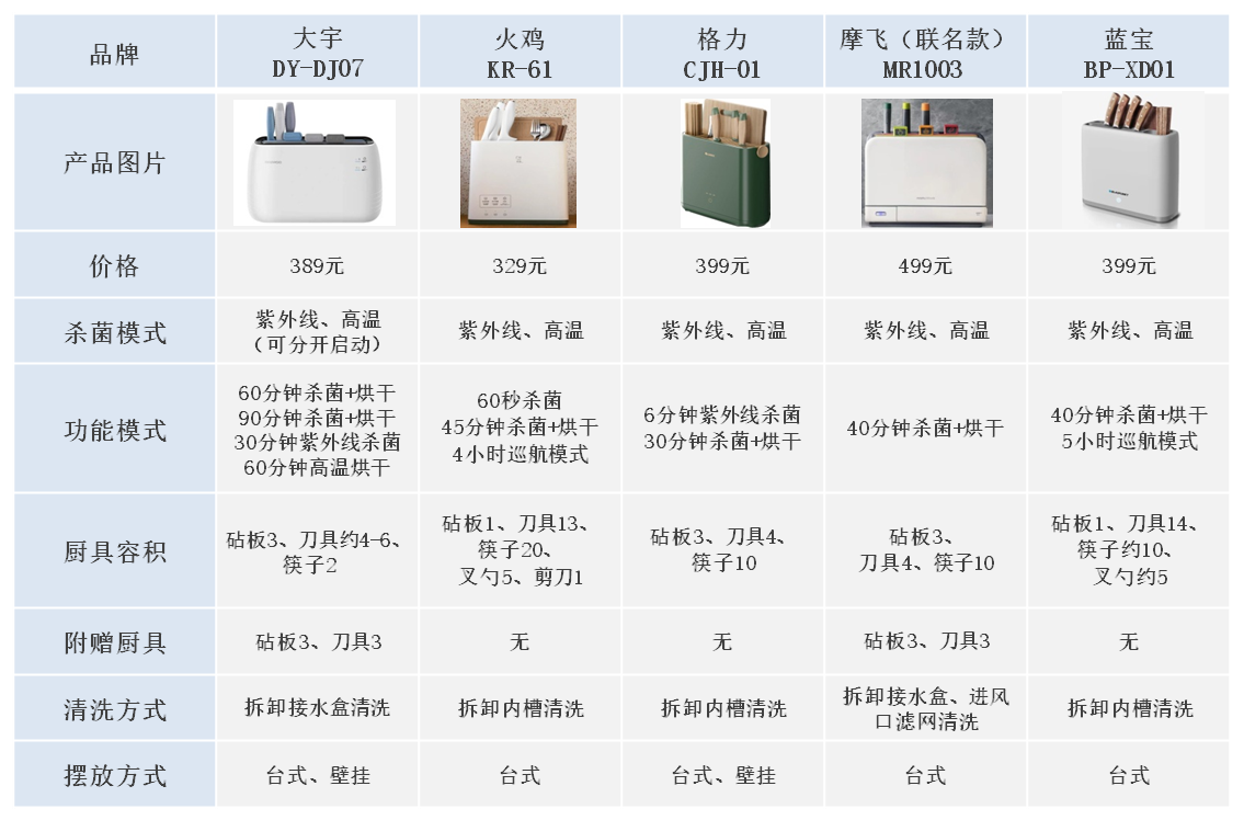 在厨具分区消毒方面,14件样品可以对砧板、刀具、筷子等常用厨具进行了分区消毒,另2件样品没有砧板消毒区。7件样品随机附赠砧板或刀具。